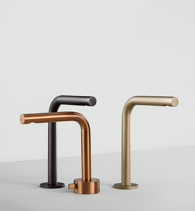 Bearing resemblance to the beautiful Vola series by Arne Jacobsen, the AF/21 bath line was designed by Naoto Fukasawa. The minimalist collection includes deck- and wall-mount faucets that can be specified with an integrated joystick control or disk-shaped handles, tub fillers, showerheads, hand showers, matching thermostatic valves and a kitchen faucet. Recently Fantini unveiled new brushed finishes for the line: gunmetal, copper bronze and British gold.