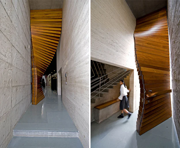 Other times, hidden doors aren’t hidden at all but rather are designed in such a way that makes them imperceptible as doors until opened. Take for example the towering Curtain Door by Matharoo Associates, which is constructed out of 40 pieces of thick Burma teak and set between concrete walls. When pushed open, the wood feathers out into a massive curve. The sculptural entryway includes 160 pulleys, 80 ball bearings, one wire rope and a hidden counterweight — much more than your average invisible hinge.
