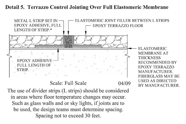 Notice how terrazzo floors are usually detailed with divider strips or control joints where floor temperature may vary, where volume change or load deflection can occur, or settlement. The following detail gives a better idea of a control join used with an epoxy terrazzo application: