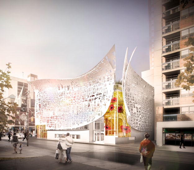 Bortolotto has just unveiled a proposal to add an interactive façade to an existing office building at the Ontario College of Art and Design. The water-jet-cut aluminum panels are perforated with an informational, non-repeating pattern that is based on the street topography of the city.