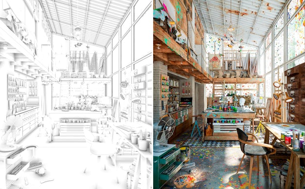 “Arts and Crafts” by Diego Querol, winner of a 2016 3D Award on CGarchitect; left: VrayExtraTexAO work-in-progress image; right: the finished rendering; images via Ronen Bekerman and CGarchitect