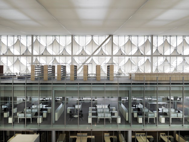 Placed at the heart of the pedestrianized Olaya District in Riyadh, the King Fahad National Library has to provide thermal comfort in external temperatures of up to 122 degrees Fahrenheit. The tensile-stressed steel cable structure acts as a membrane, stretching its fabric to minimize solar penetration while introducing passive cooling across all floors.