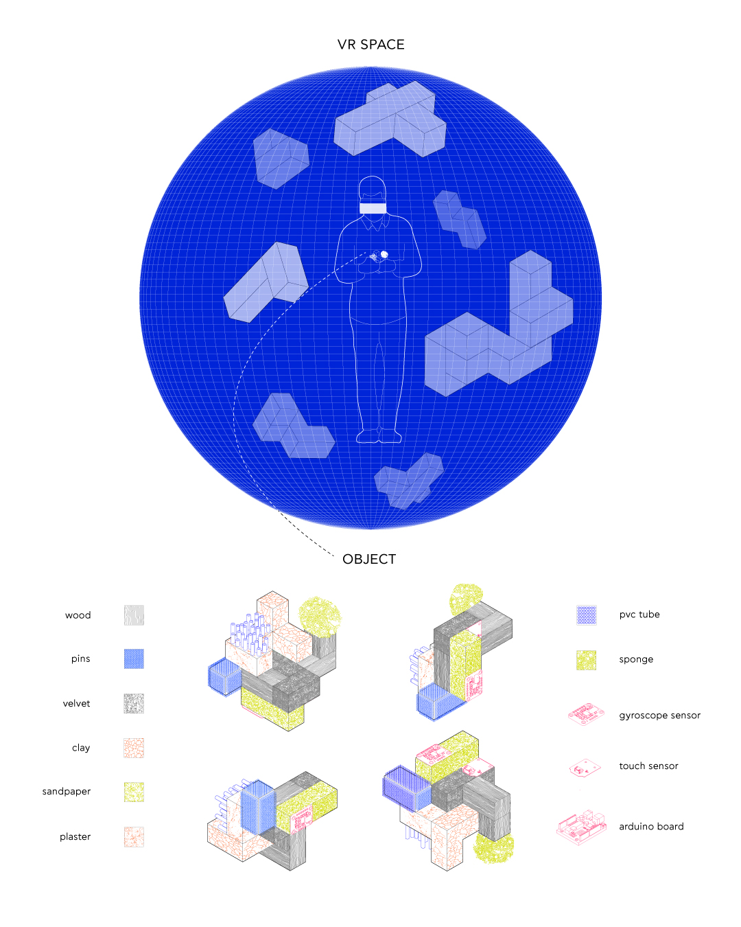 Starting out the project we experimented with small scale handheld objects which the would inform and guide your vision in the virtual space. this first design evolved from a two dimensional maze into a complex tactile 3D object. combining different sensory stimuli with embedded sensors to capture the participants interaction with the object and translate it to the virtual space.