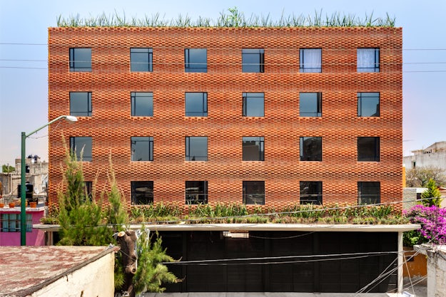 Masonry brick walls play an important role in this social housing project, where they are reinterpreted to blur the boundaries between structure and ornament. Exploring light, pattern and rhythm, the façade uses a single red mud brick unit with multiple mutation details to form an undulating aesthetic.
